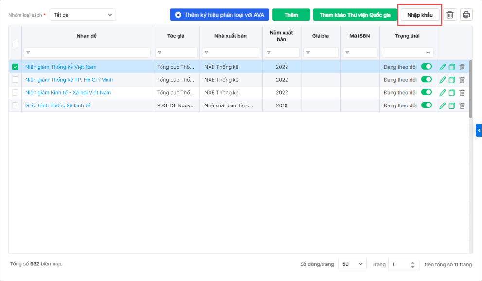 - Nhập khẩu thêm mới: Để thêm mới nhanh hàng loạt biên mục sách.