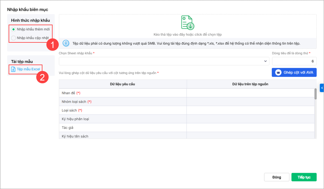 - Tải lên file excel biên mục, phần mềm tự động ghép cột dữ liệu tương ứng trên file và trên phần mềm. Anh/chị có thể thay đổi nếu muốn, nhấn Tiếp tục.