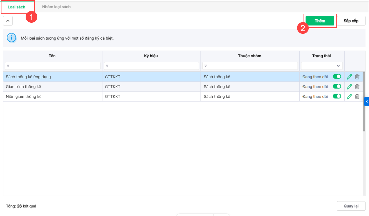 - Nhấn Loại sách/Thêm để thêm loại sách