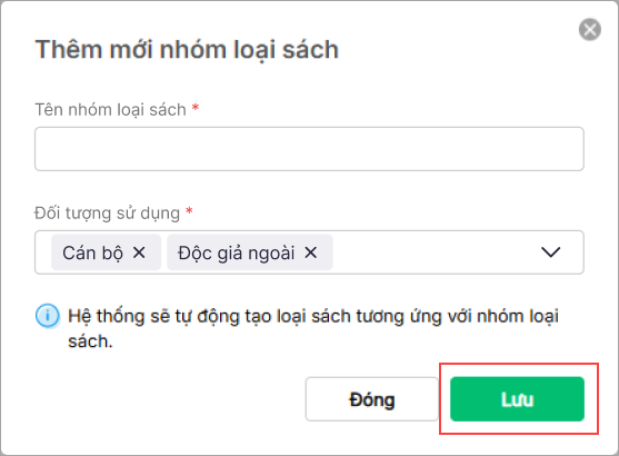 - để thêm nhóm loại sách, khai báo Tên của Nhóm loại sách. Nhấn Lưu sau khi hoàn tất.