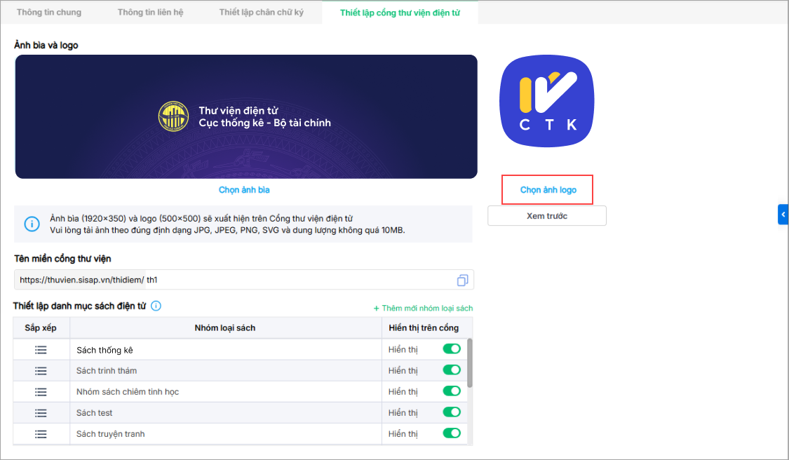 - Phần mềm mặc định ảnh bìa và logo gợi ý hiển thị trên Cổng thư viện điện tử. Anh/chị có thể chọn lại ảnh bìa/logo đơn vị bằng cách nhấn vào Chọn ảnh bìa hoặc Chọn ảnh logo và tải lên ảnh mong muốn.