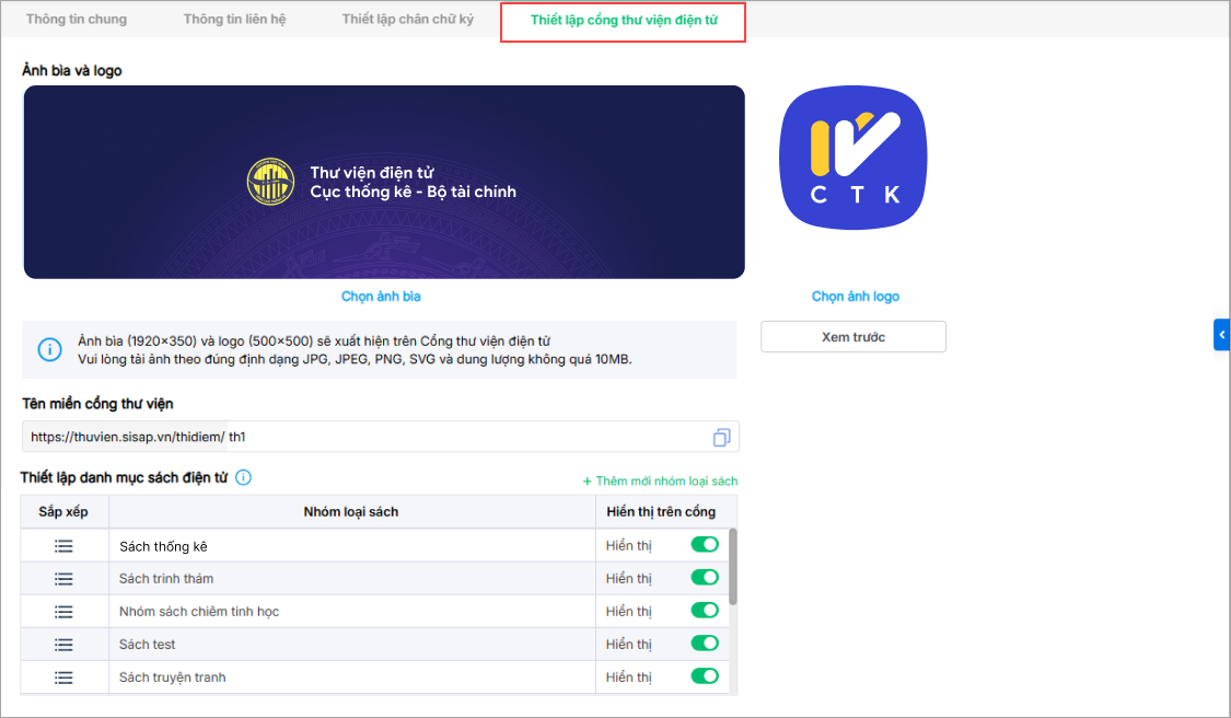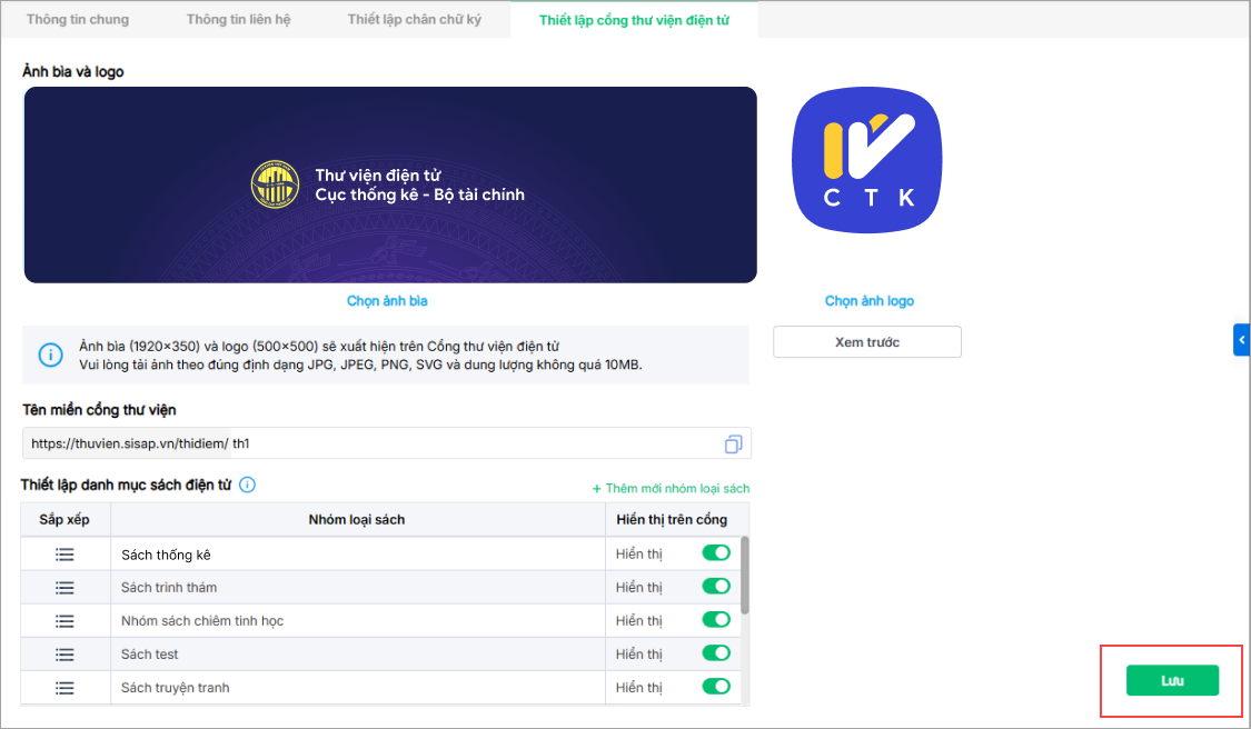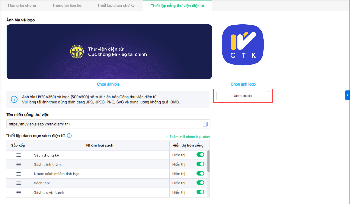 - Nhấn Xem trước để kiểm tra giao diện hiển thị trên Cổng thư viện trước khi lưu.