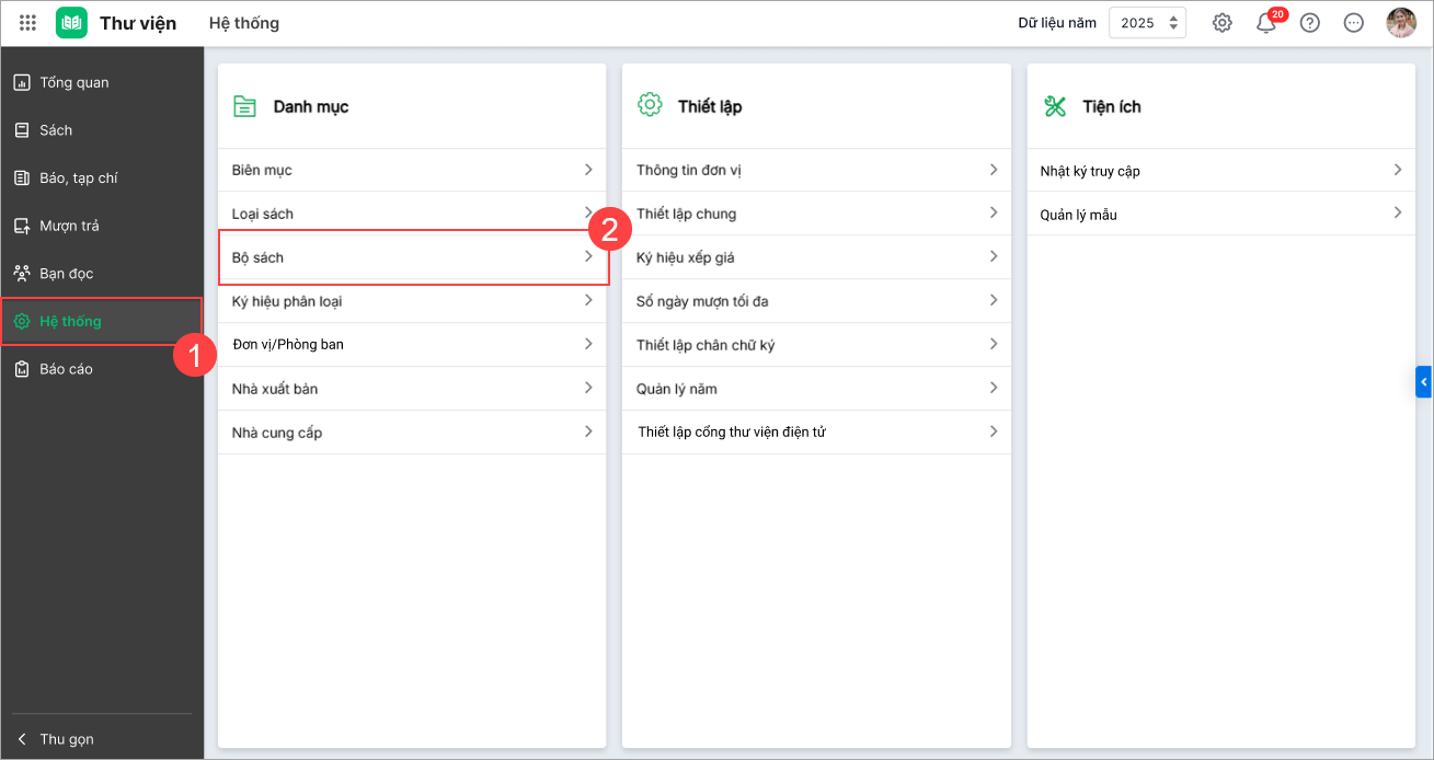 1. Anh/chị vào menu Hệ thống\Bộ sách