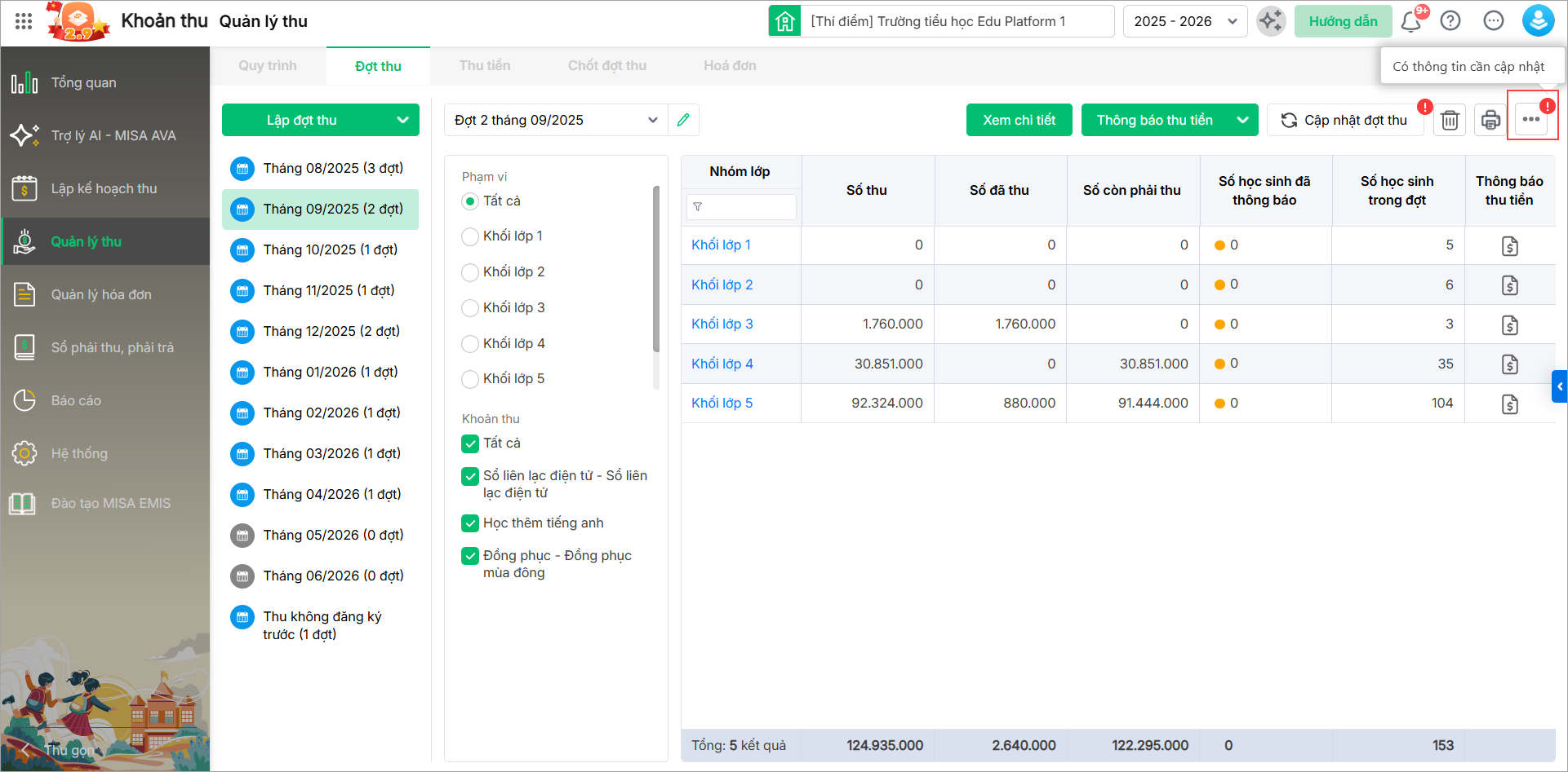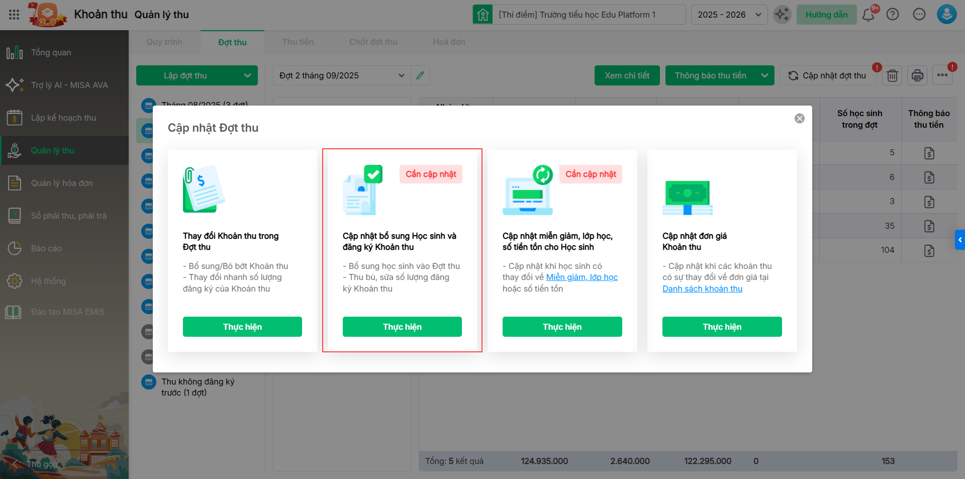 - Do đó, phải cập nhật danh sách đăng ký khoản thu linh hoạt cho từng học sinh trong từng đợt thu.