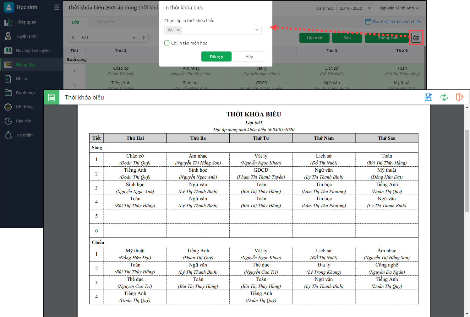 • Chọn xem thời khóa biểu theo lớp, nhấn biểu tượng “máy in”
