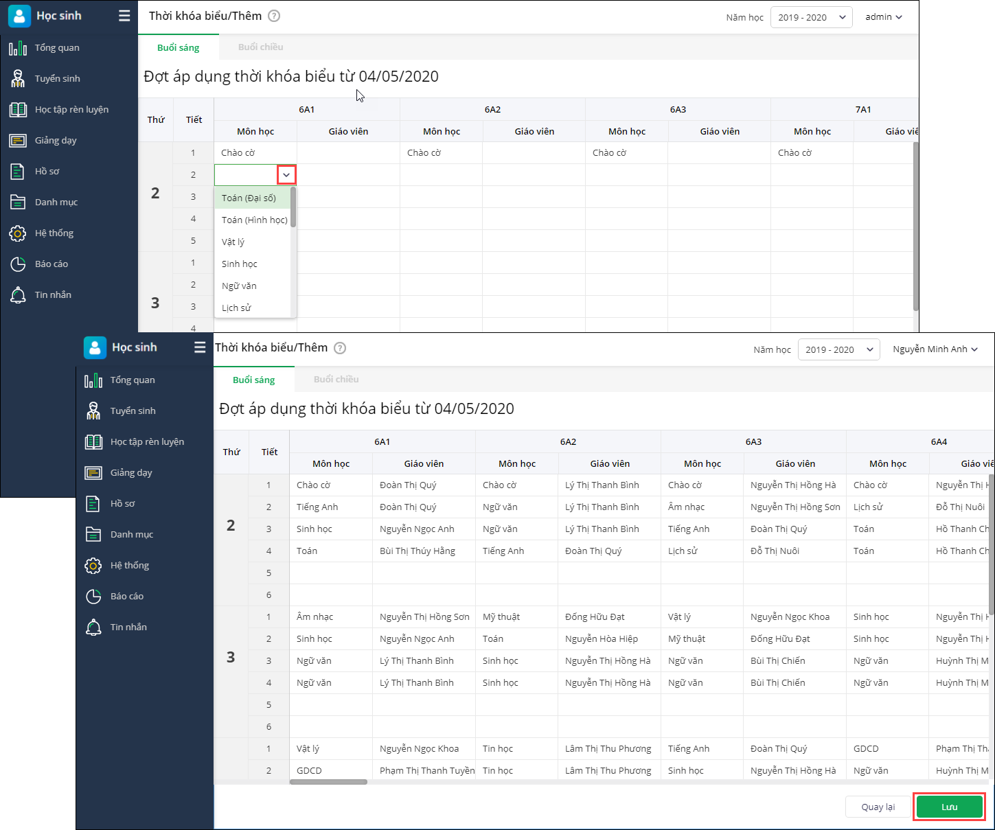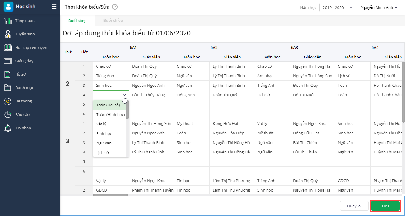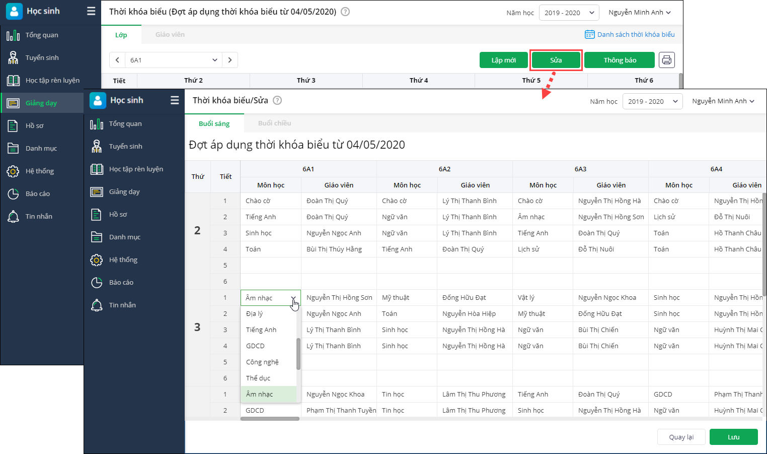 • Sửa lại các thông tin về môn học hoặc giáo viên, nhấn Lưu.