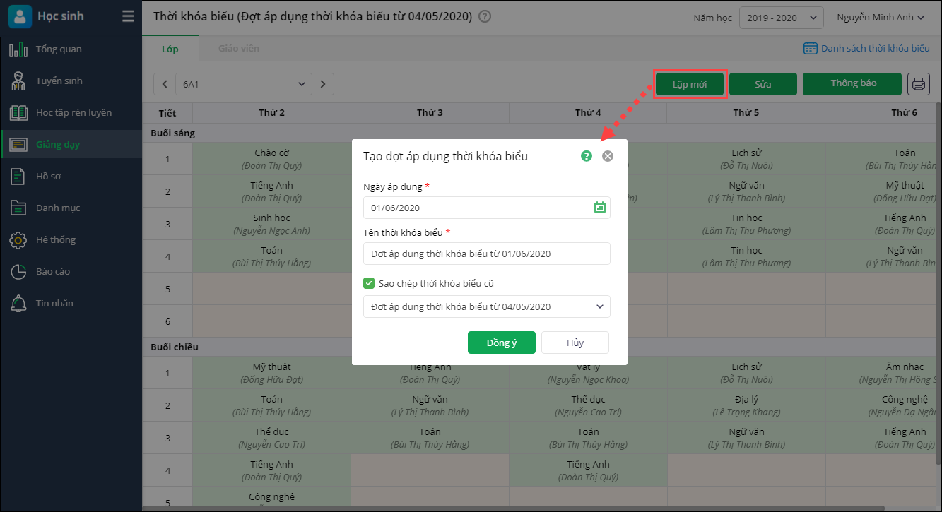 Trong trường hợp nhà trường muốn lập thời khóa biểu mới với ngày áp dụng mới thì có thể thực hiện như sau: