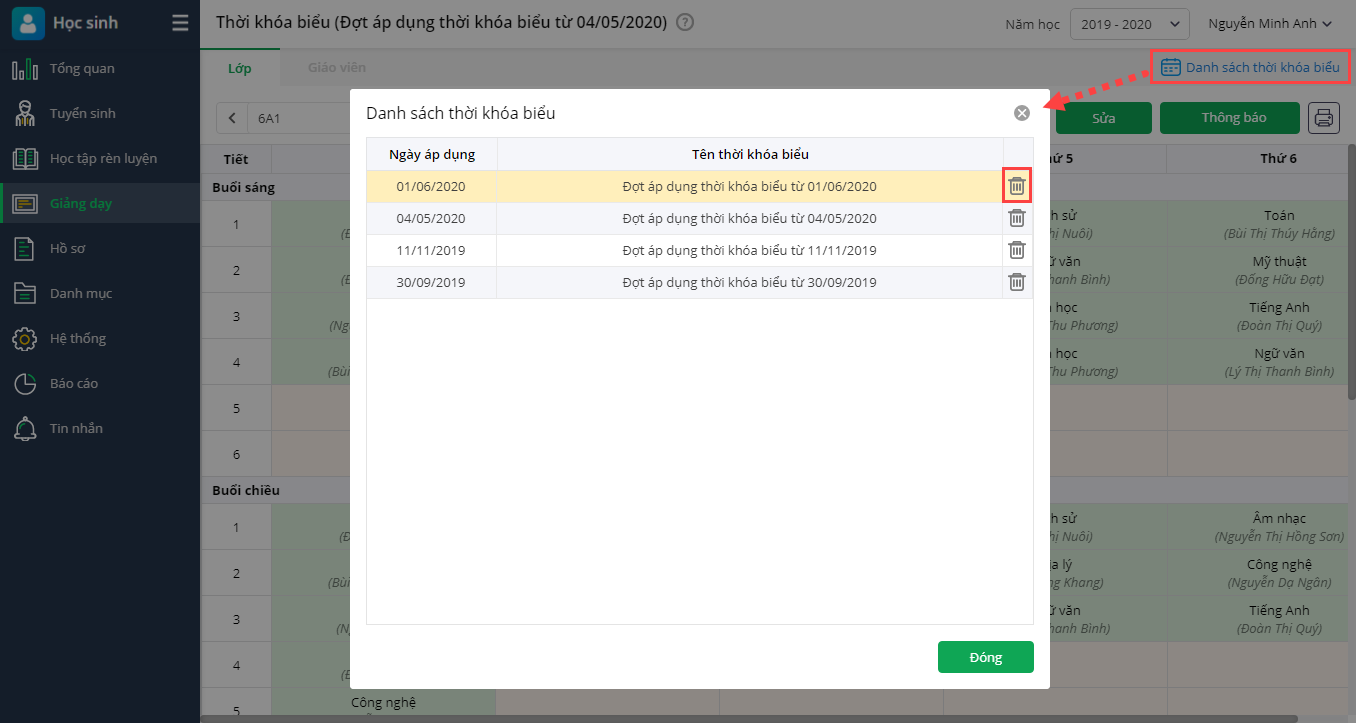 • Phần mềm lấy lên danh sách thời khóa biểu anh/chị đã tạo, nhấn biểu tượng “thùng rác” tại thời khóa biểu cần xóa