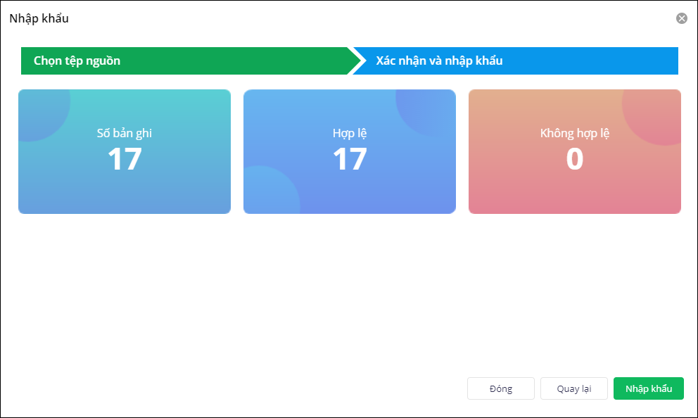 7.  Nhấn Tiếp theo. Phần mềm chuyển sang bước 2: Xác nhận và nhập khẩu. Có thể sử dụng Tải tất cả bản ghi/chỉ tải những bản ghi không hợp lệ để tải về file chứa dữ liệu không hợp lệ để theo dõi được chi tiết lỗi