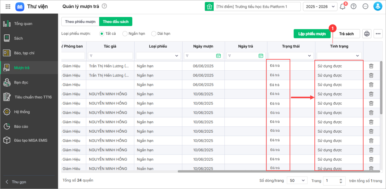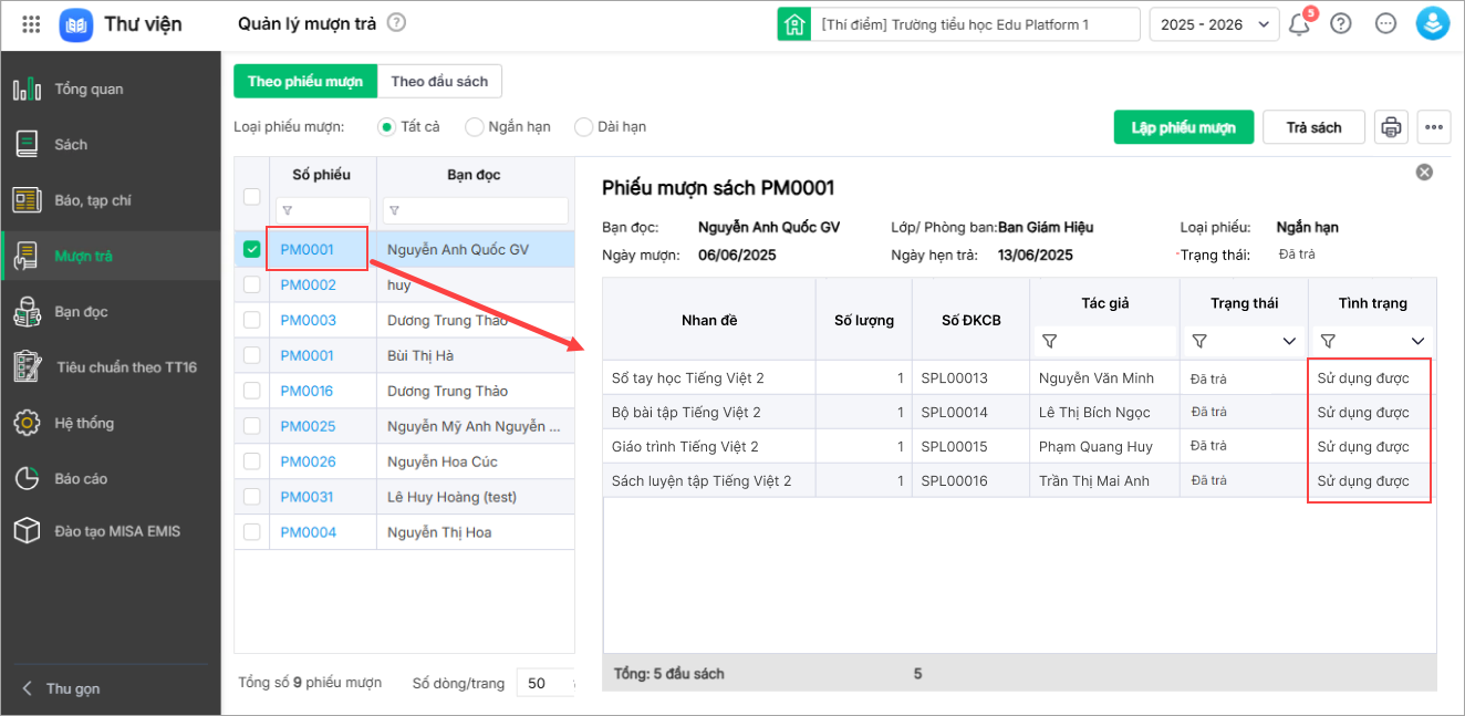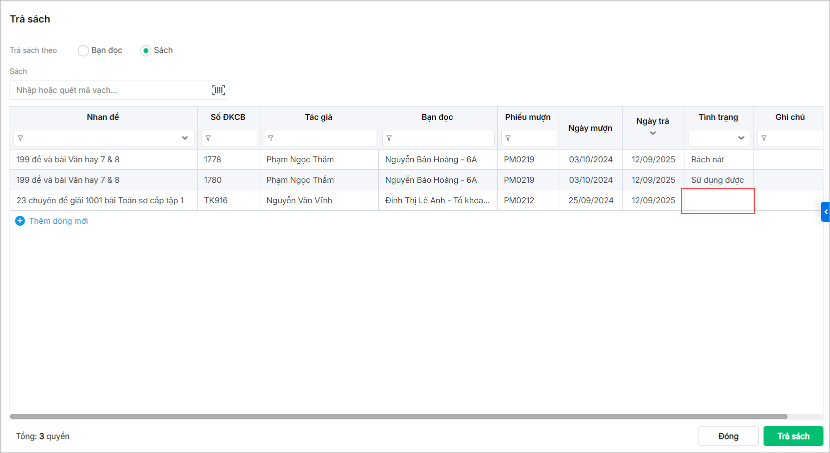 Cán bộ thư viện muốn xem lại được tình trạng sách đã trả để dễ dàng kiểm tra, đối chiếu với sổ sách.