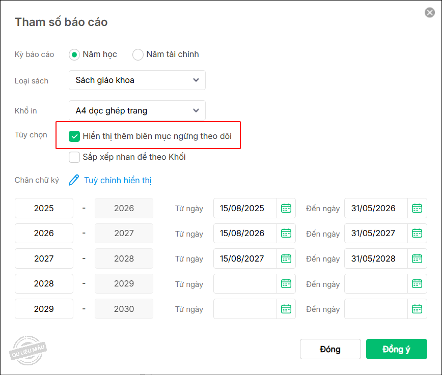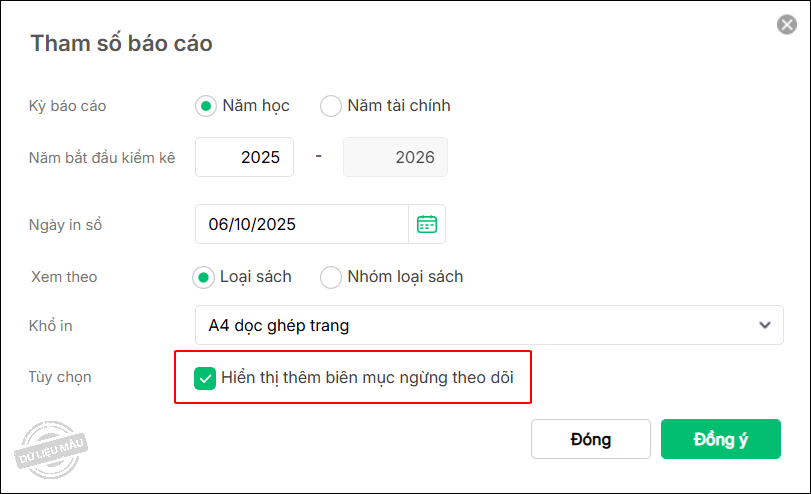 Khi lập báo cáo TV-S01 và TV-S02, phần mềm bổ sung tùy chọn hiển thị biên mục ngừng theo dõi, cán bộ thư viện có thể chọn hiển thị hoặc không để đảm bảo số liệu trên 2 báo cáo trùng khớp nhau.