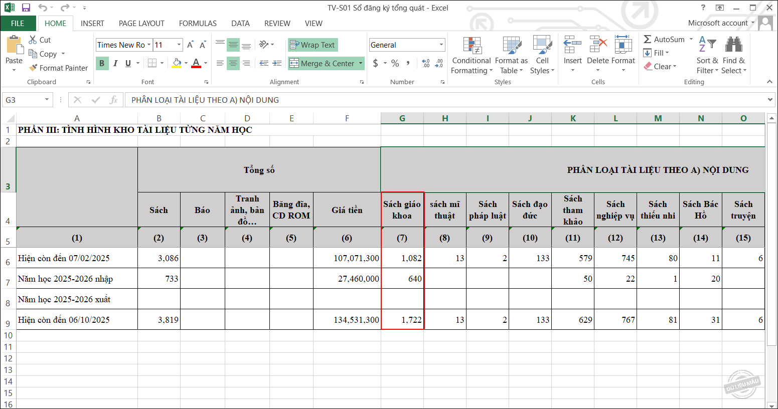 - Trên báo cáo TV-S01: Sổ đăng ký tổng quát, phần mềm đáp ứng lấy lên tổng biên mục Đang theo dõi theo từng nhóm loại sách, loại sách.