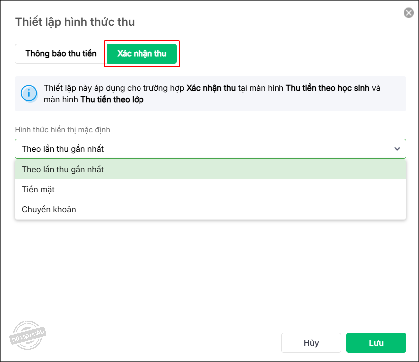 - Tại màn hình Hệ thống\Thiết lập hình thức thu\Xác nhận thu, phần mềm đáp ứng thiết lập hình thức thu khi gạch nợ thủ công, tuy nhiên chỉ áp dụng cho phạm vi học sinh và từng lớp.