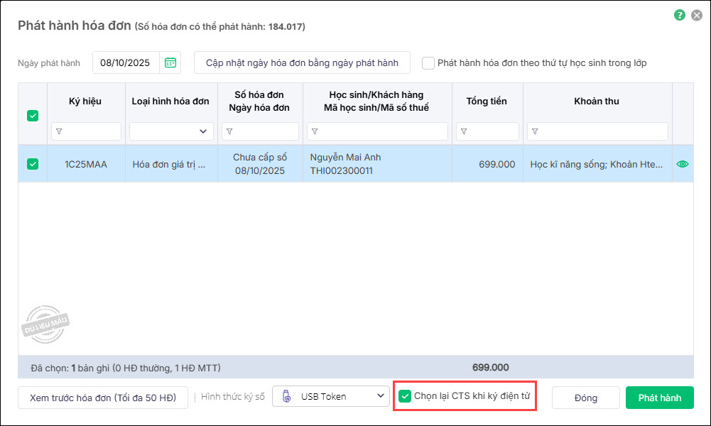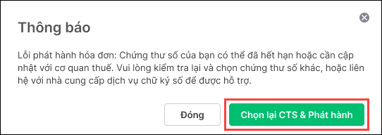 Khi phát hành hóa đơn, phần mềm cho phép chọn lại CTS trong trường hợp kế toán chọn sai.