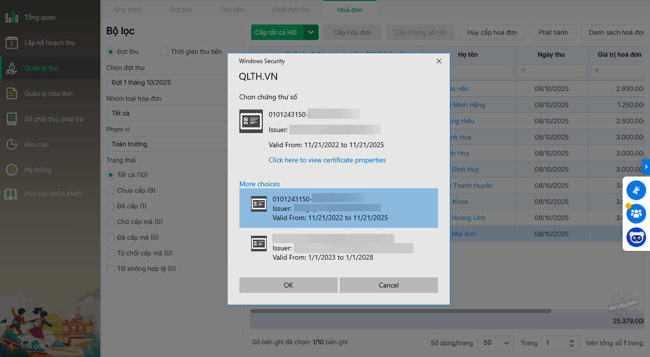 Khi phát hành hóa đơn, nếu có nhiều CTS thì kế toán phải chọn CTS hợp lệ.