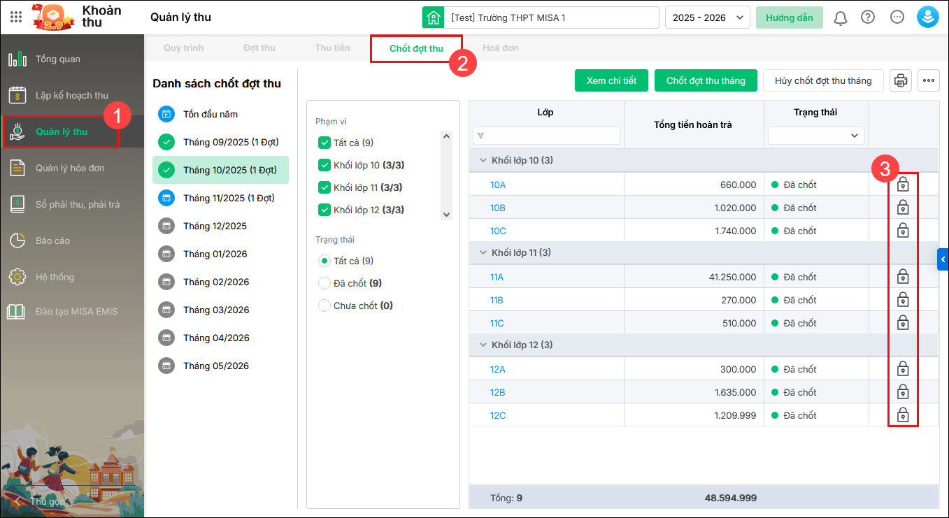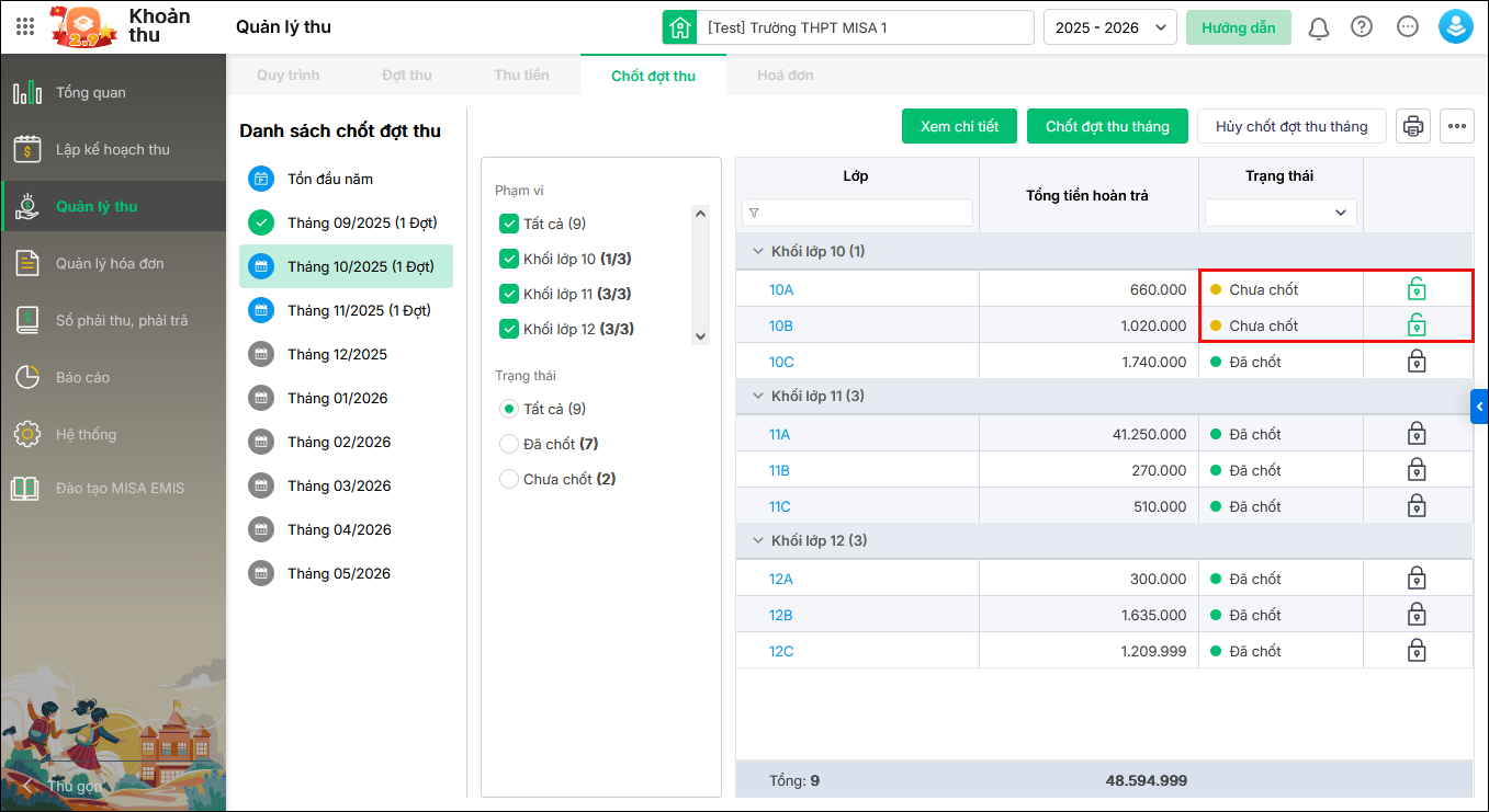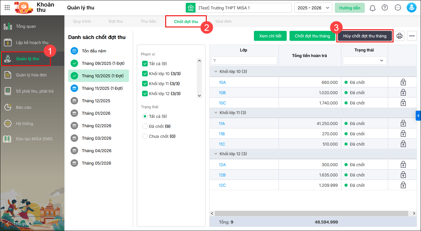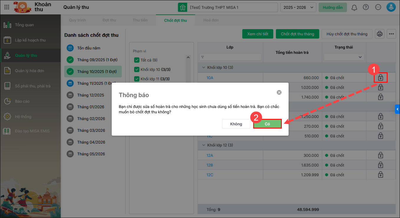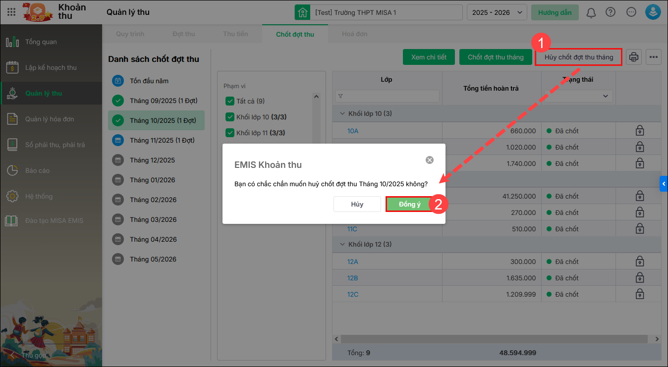 Cách 1: Hủy chốt đợt thu cho toàn trường