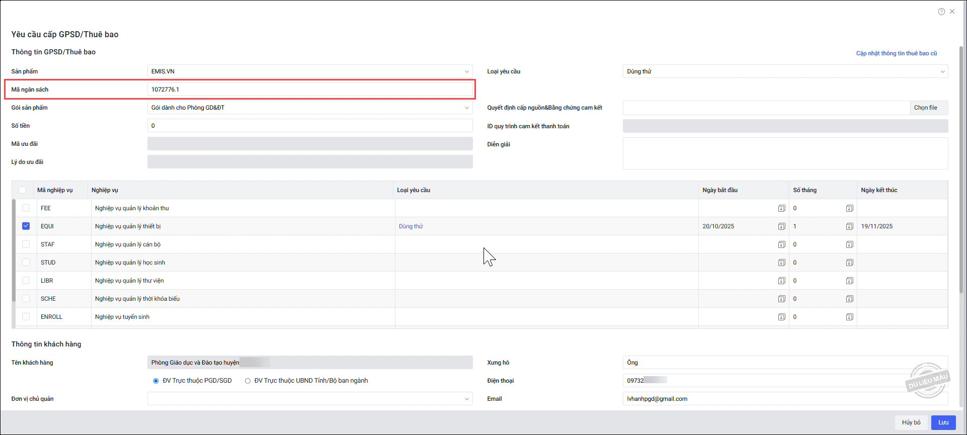 - Mã ngân sách ĐVCQ: Đối với khối mầm non, tiểu học, THCS, điền mã ngân sách Phòng Giáo dục tương ứng; đối với khối THPT, điền mã ngân sách của Sở Giáo dục.