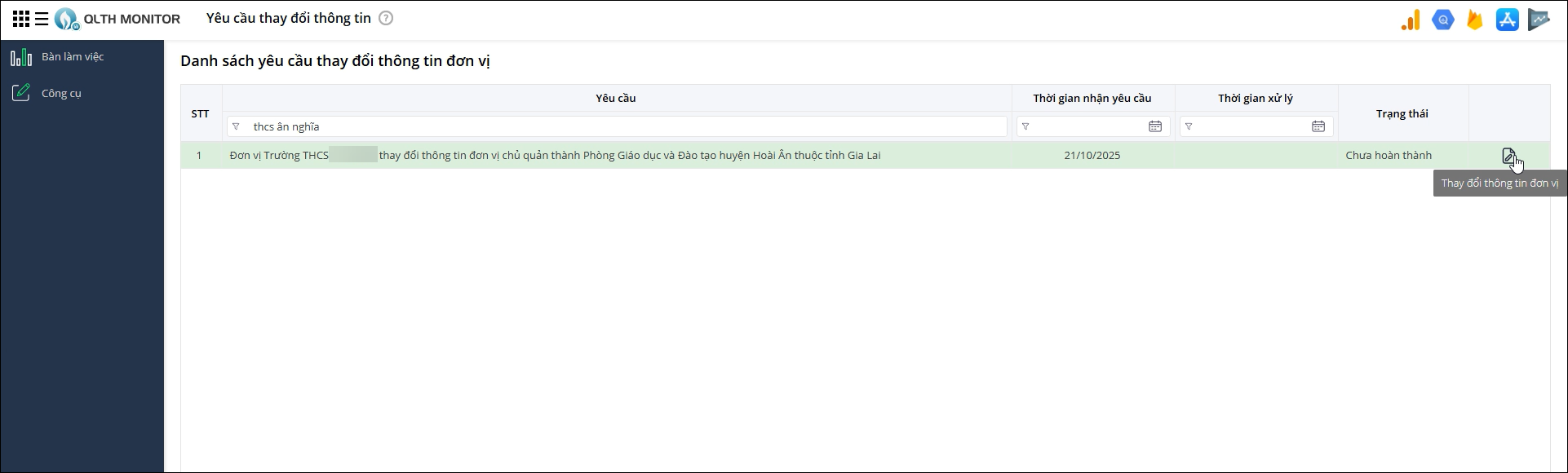 - Hệ thống sẽ lấy lên danh sách danh sách các đơn vị được yêu cầu chuyển đổi thông tin. Anh/chị chọn đơn vị mình cần chuyển đổi, nhấn vào biểu tượng chức năng Thay đổi thông tin đơn vị ở cuối dòng .