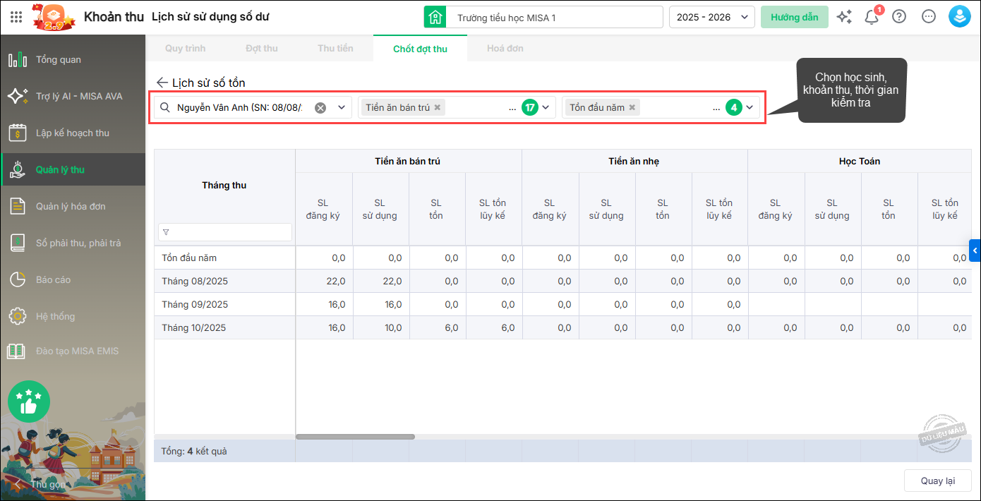 Phần mềm đáp ứng cho người dùng tùy chọn cách sử dụng tiền tồn, xem số tồn lũy kế đầu tháng và tồn cuối tháng, tuy nhiên chưa thể hiện lịch sử số tồn của học sinh qua các tháng.