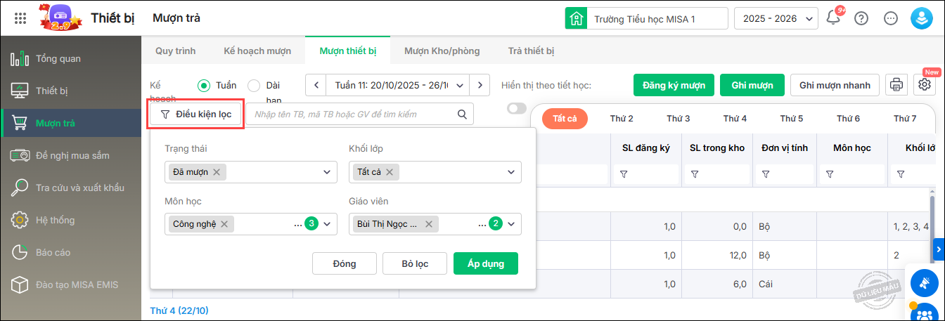 Do đó, khi ghi mượn cho giáo viên, cán bộ thiết bị cần lọc kỹ các phiếu đăng ký mượn theo giáo viên, thiết bị/kho phòng hoặc môn học để ghi mượn cho đúng người.