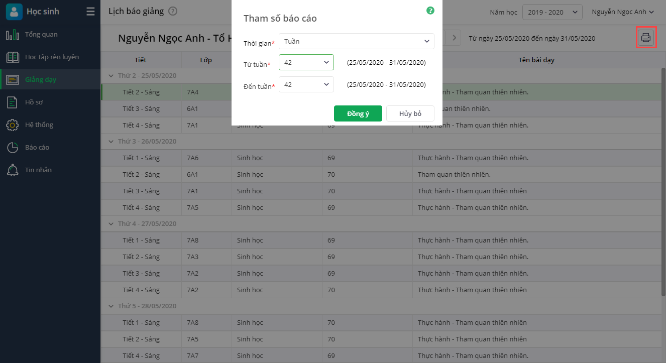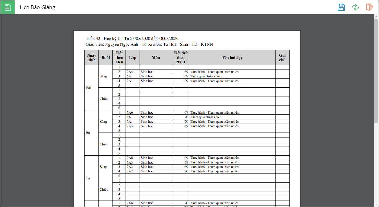 Với vai trò giáo viên có thể in được lịch báo giảng của mình theo các tuần khác nhau.