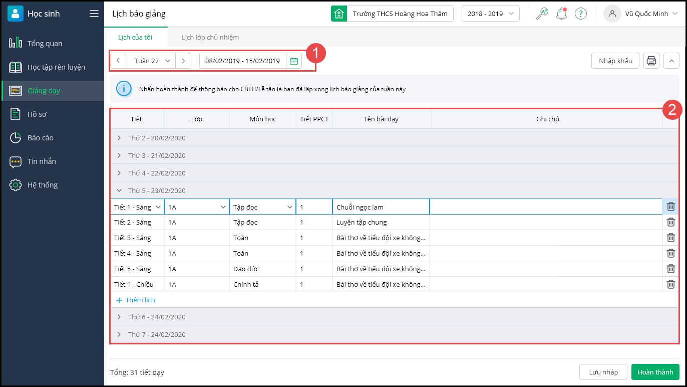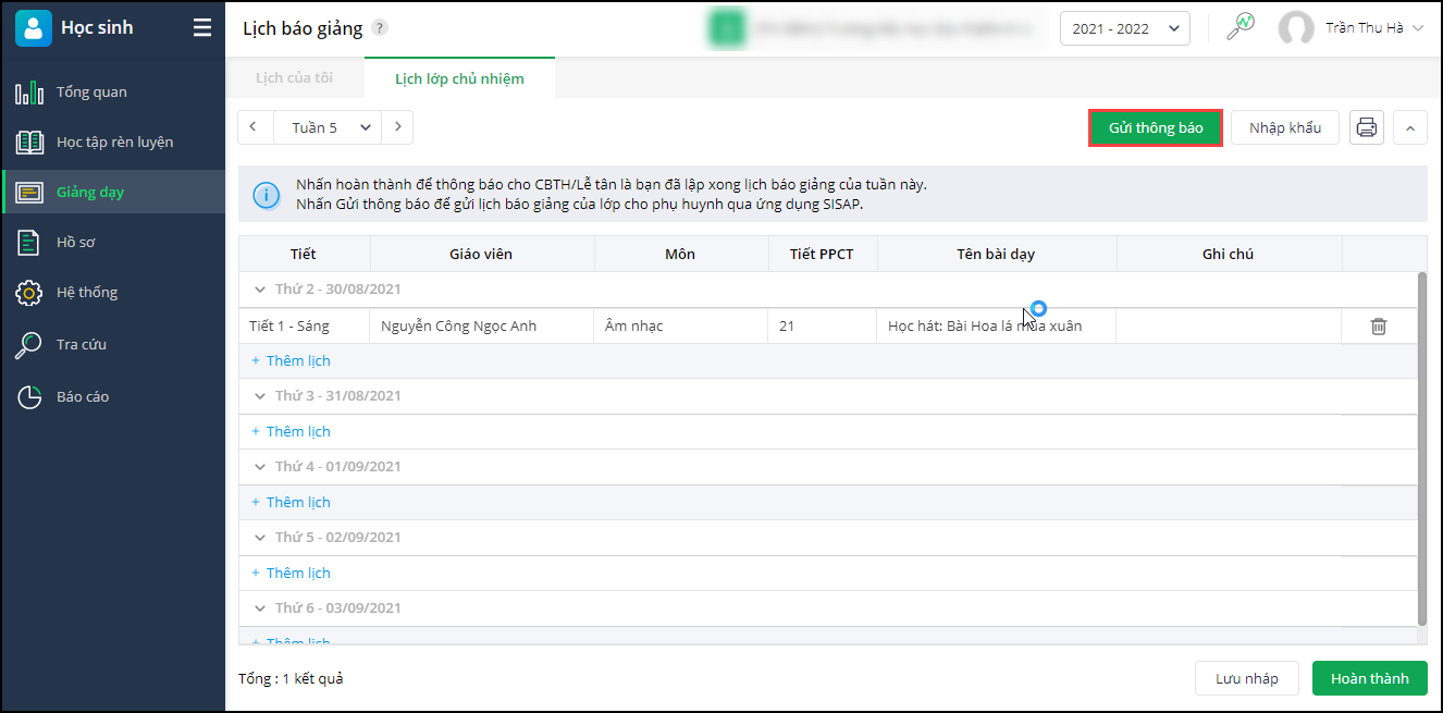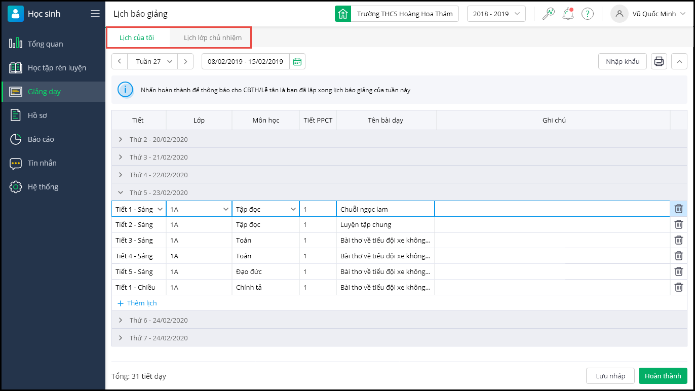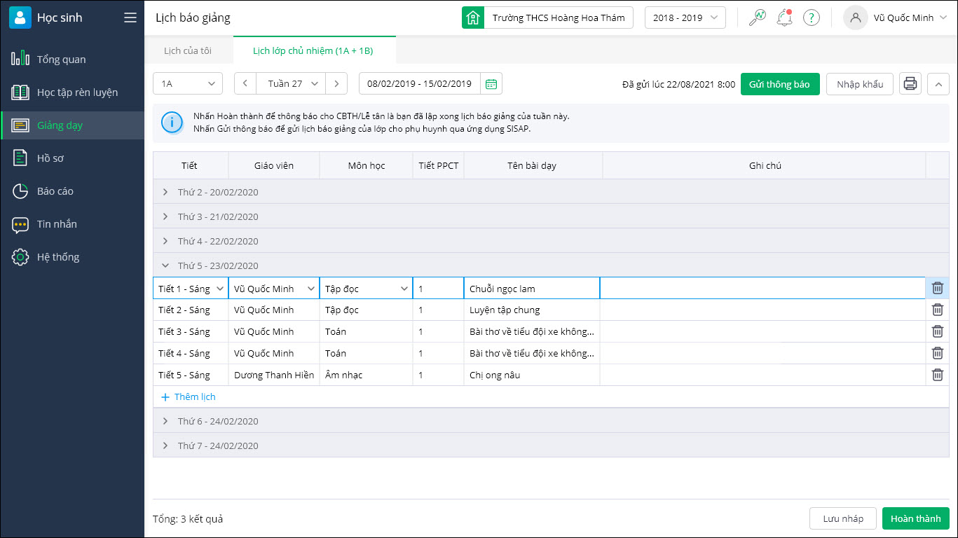 - Nhấn Hoàn thành để cập nhật thông tin lịch báo giảng của giáo viên chủ nhiệm và hiệu trưởng.