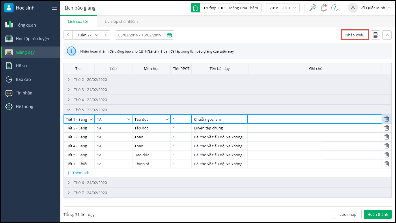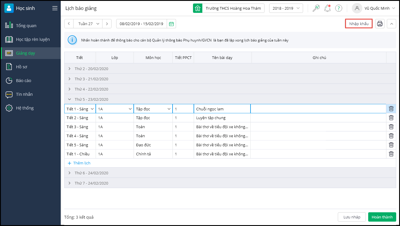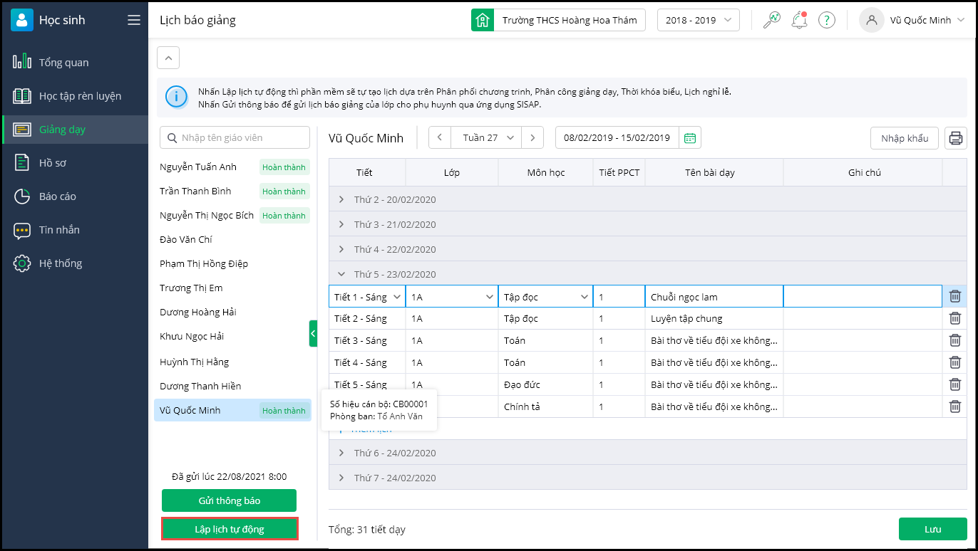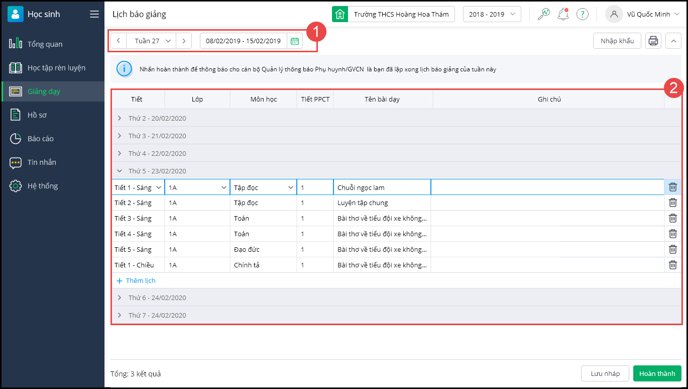 - Nhấn Hoàn thành để cập nhật thông tin lịch báo giảng của giáo viên chủ nhiệm và hiệu trưởng.