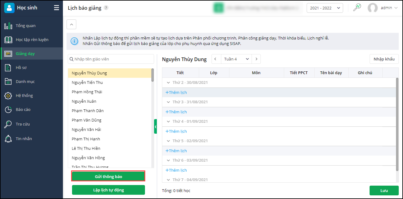 - Nhấn Lưu để lưu lịch báo giảng đã lập. Nhấn Gửi thông báo để gửi lịch báo giảng cho phụ huynh thông qua SMS hoặc SISAP.
