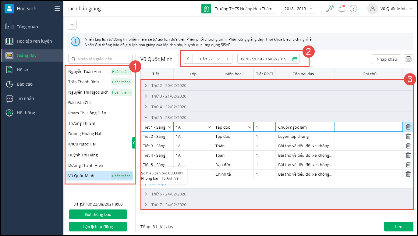 - Chọn giáo viên, tuần học hoặc thời gian và lập lịch báo giảng cho mỗi ngày trong thời gian đã chọn đã chọn.