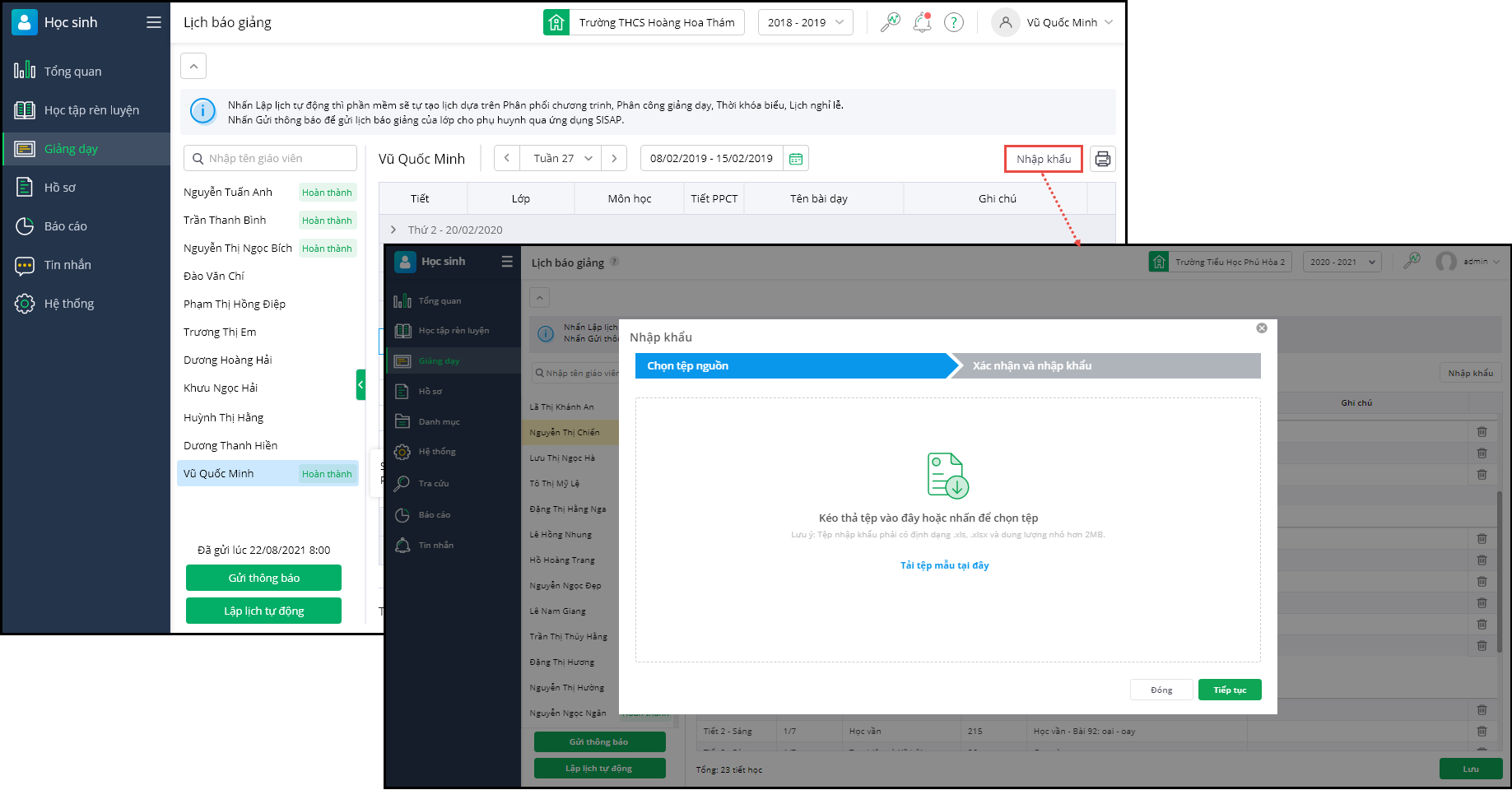 - Để sử dụng lịch báo giảng đã lập sẵn bằng tệp excel, anh chị nhấn Nhập khẩu, tải tệp mẫu và sao chép thông tin từ tệp excel đang quản lý sang tệp mẫu, sau đó tải tệp mẫu chứa dữ liệu lên chương trình