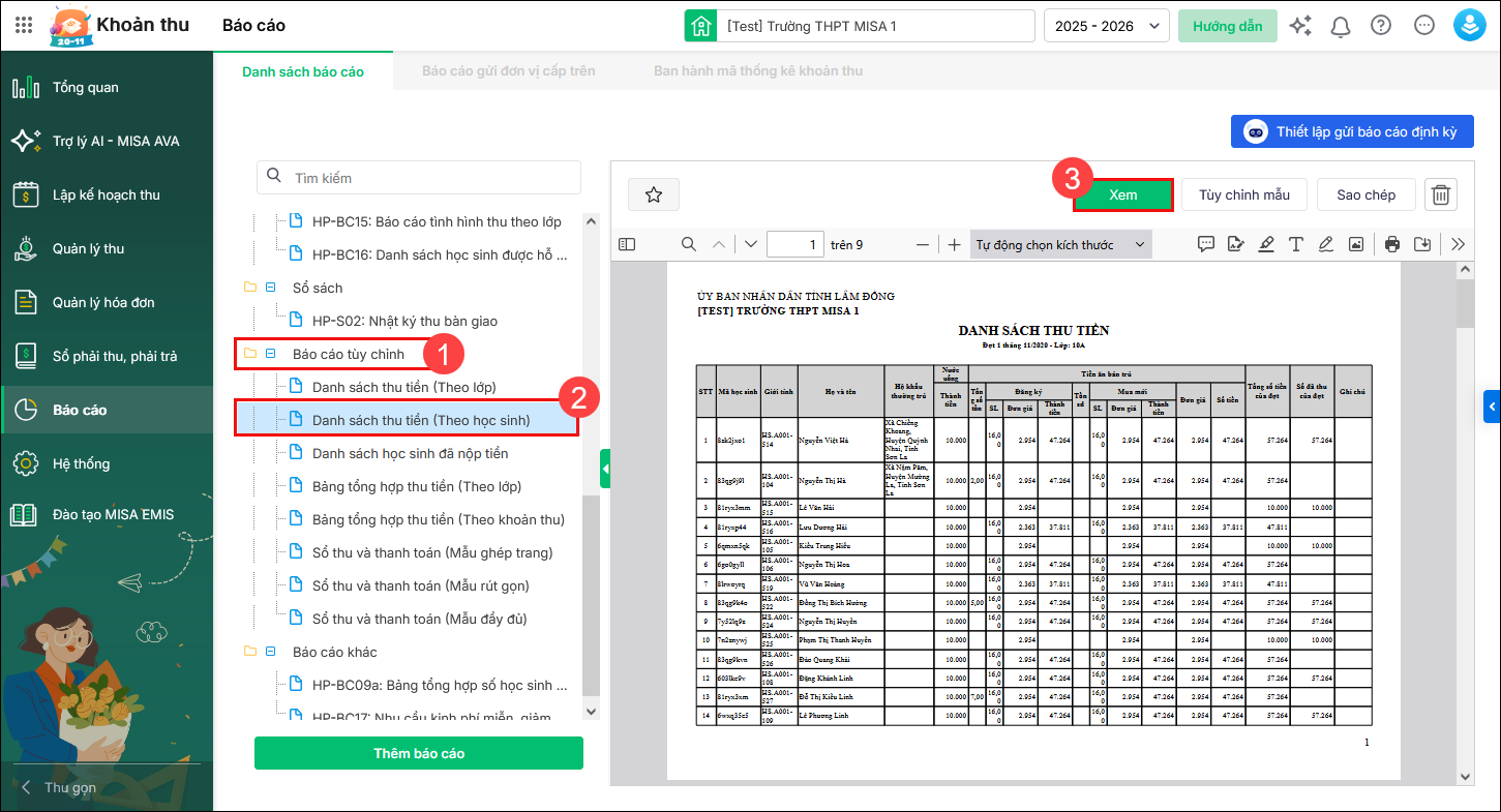 Bước 2: Trên danh sách báo cáo, tìm mục Báo cáo tùy chỉnh, chọn Danh sách thu tiền (theo học sinh). Nhấn Xem hoặc kích đúp chuột vào Danh sách thu tiền (theo học sinh).