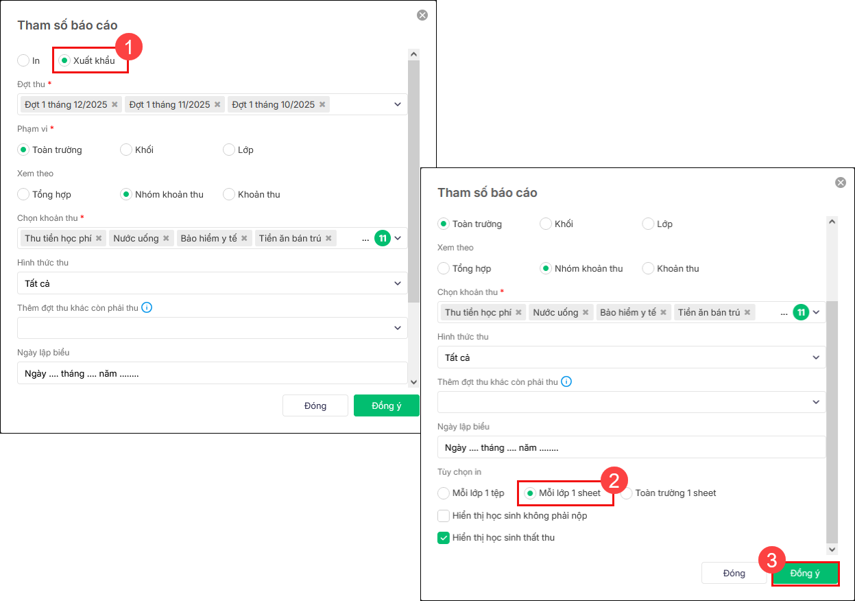 - Chọn Phạm vi thu (Toàn trường; Khối; Lớp)