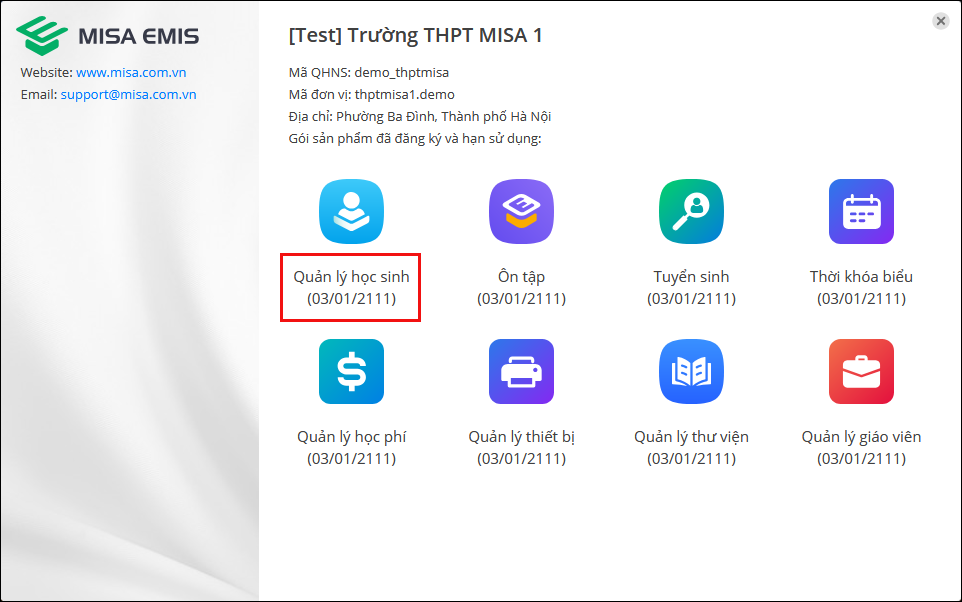 Bước 2: Phần mềm sẽ hiển thị toàn bộ phân hệ mà đơn vị đã đăng ký sử dụng trên phần mềm EMIS và thông tin ngày hết hạn tương ứng.