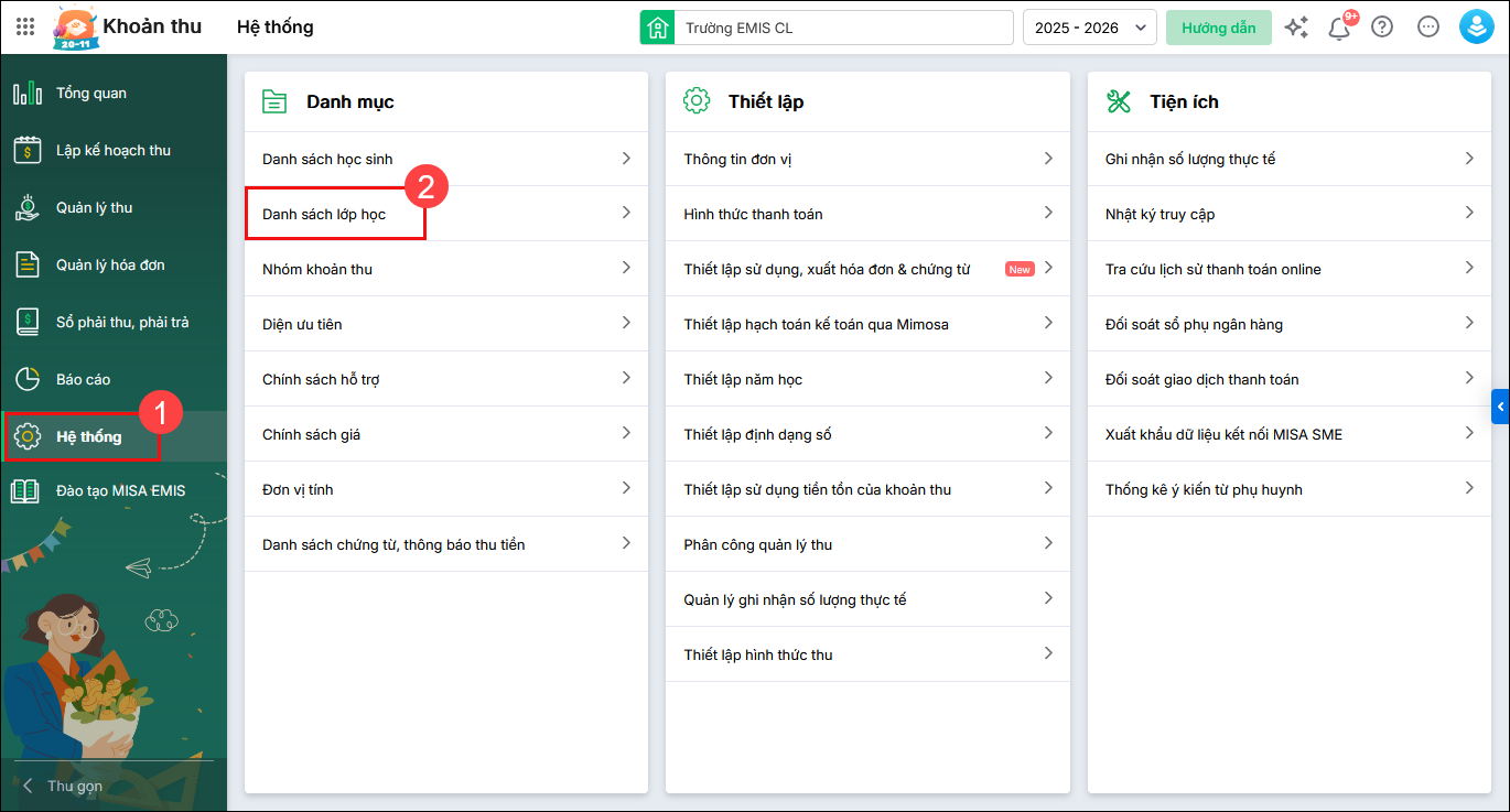 Bước 1: Vào Hệ thống\Danh sách lớp học. Xem hướng dẫn chi tiết tại đây.