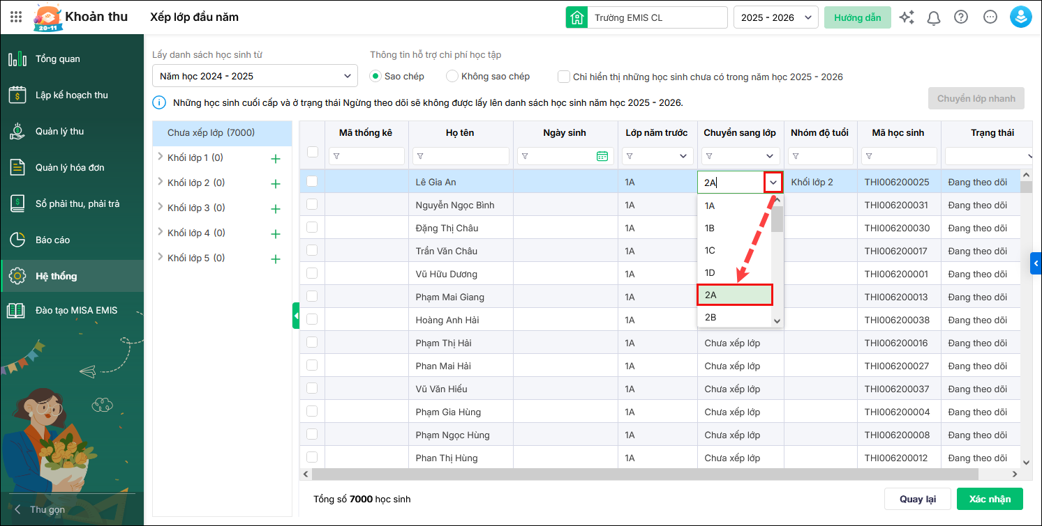 Bước 6: Tích chọn những học sinh đã chọn Lớp trong năm học mới, nhấn Xác nhận.
