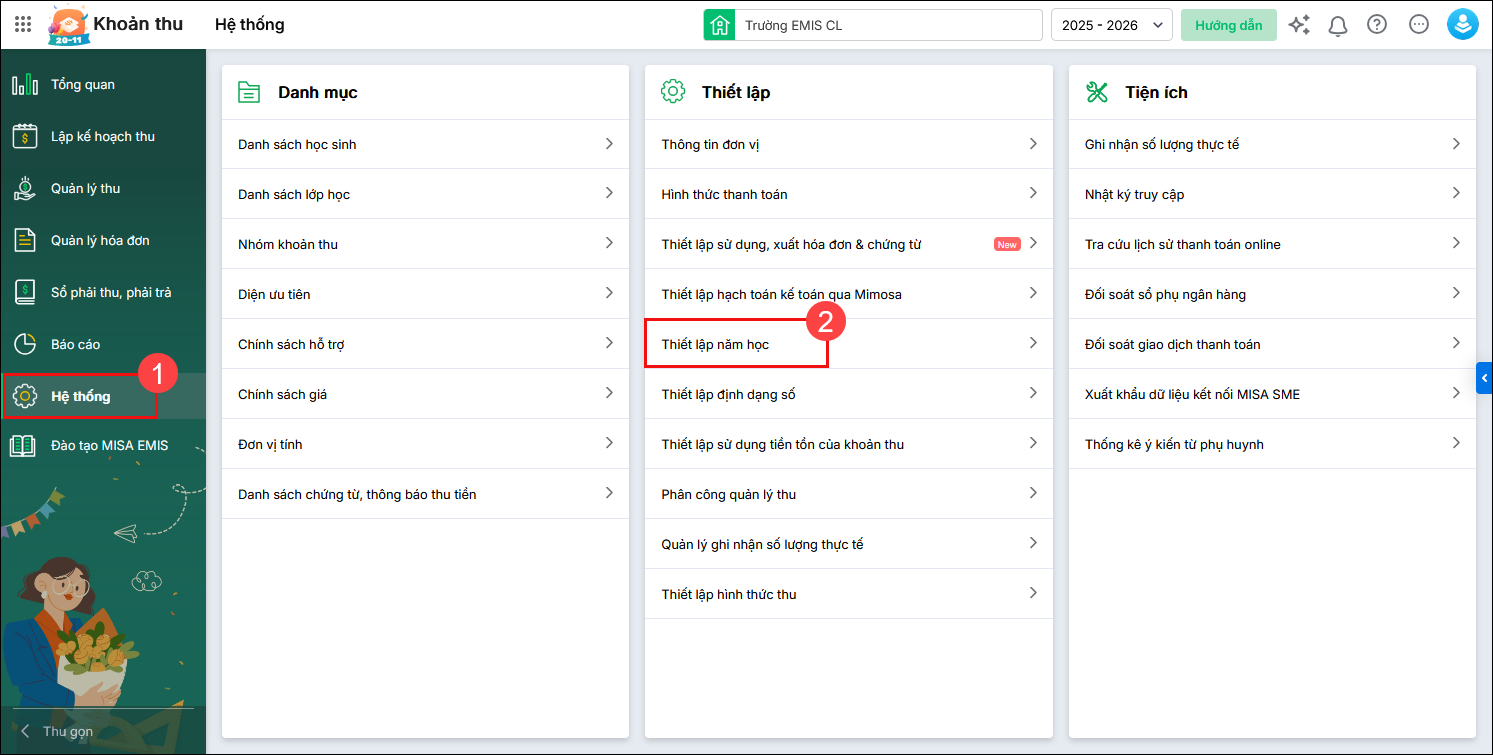 Bước 1: Vào Hệ thống\Thiết lập năm học.