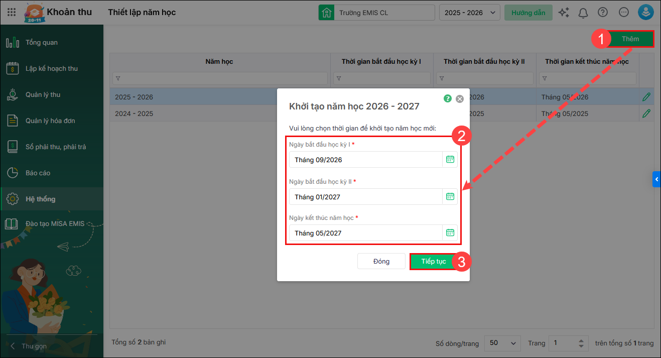 Bước 2: Nhấn Thêm, chọn Ngày bắt đầu học kỳ I; Ngày bắt đầu học kỳ II và Ngày kết thúc năm học. Nhấn Tiếp tục.