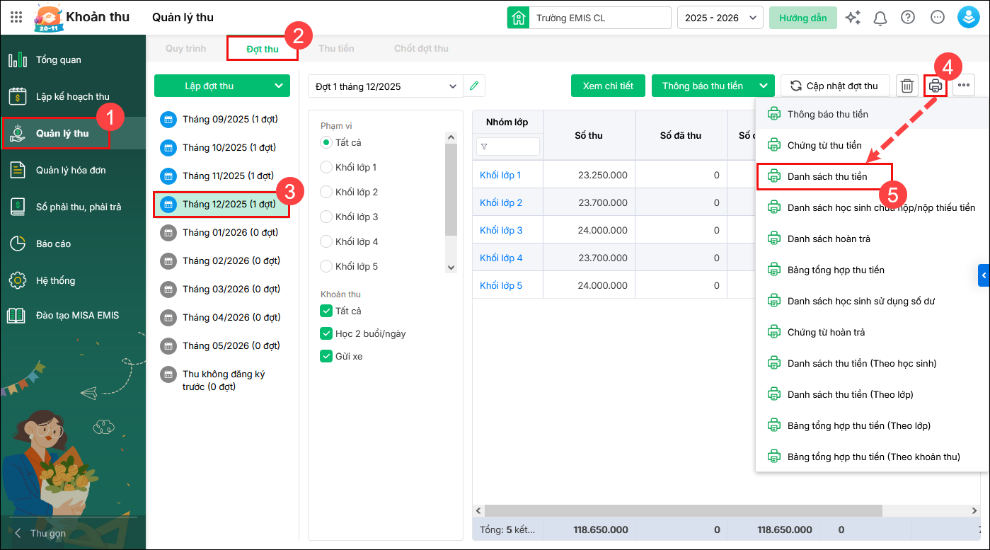 Bước 1: Vào Quản lý thu\Đợt thu, chọn đợt thu. Nhấn vào biểu tượng máy in, chọn Danh sách thu tiền.