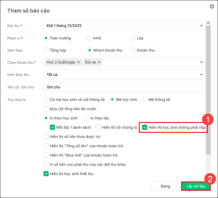 Bước 2: Chọn tham số báo cáo, tích vào ô Hiển thị học sinh không phải nộp. Nhấn Lấy dữ liệu.