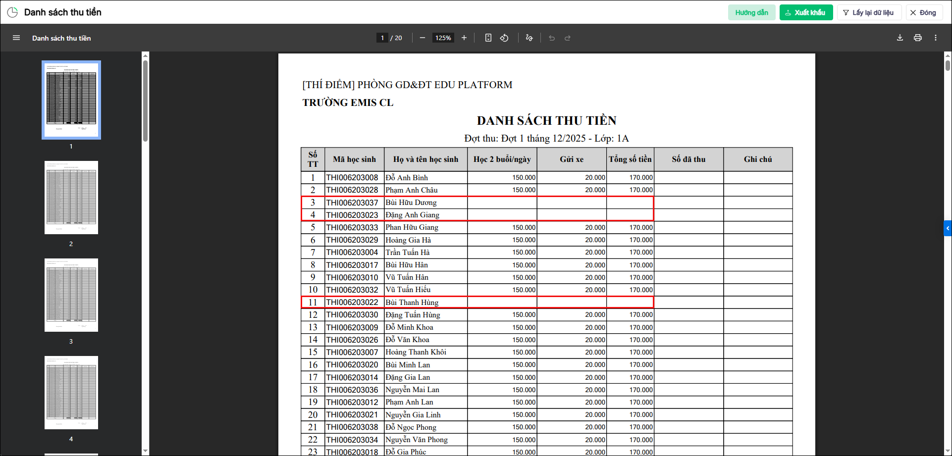 4. Xem danh sách học sinh không phải nộp tiền như thế nào?