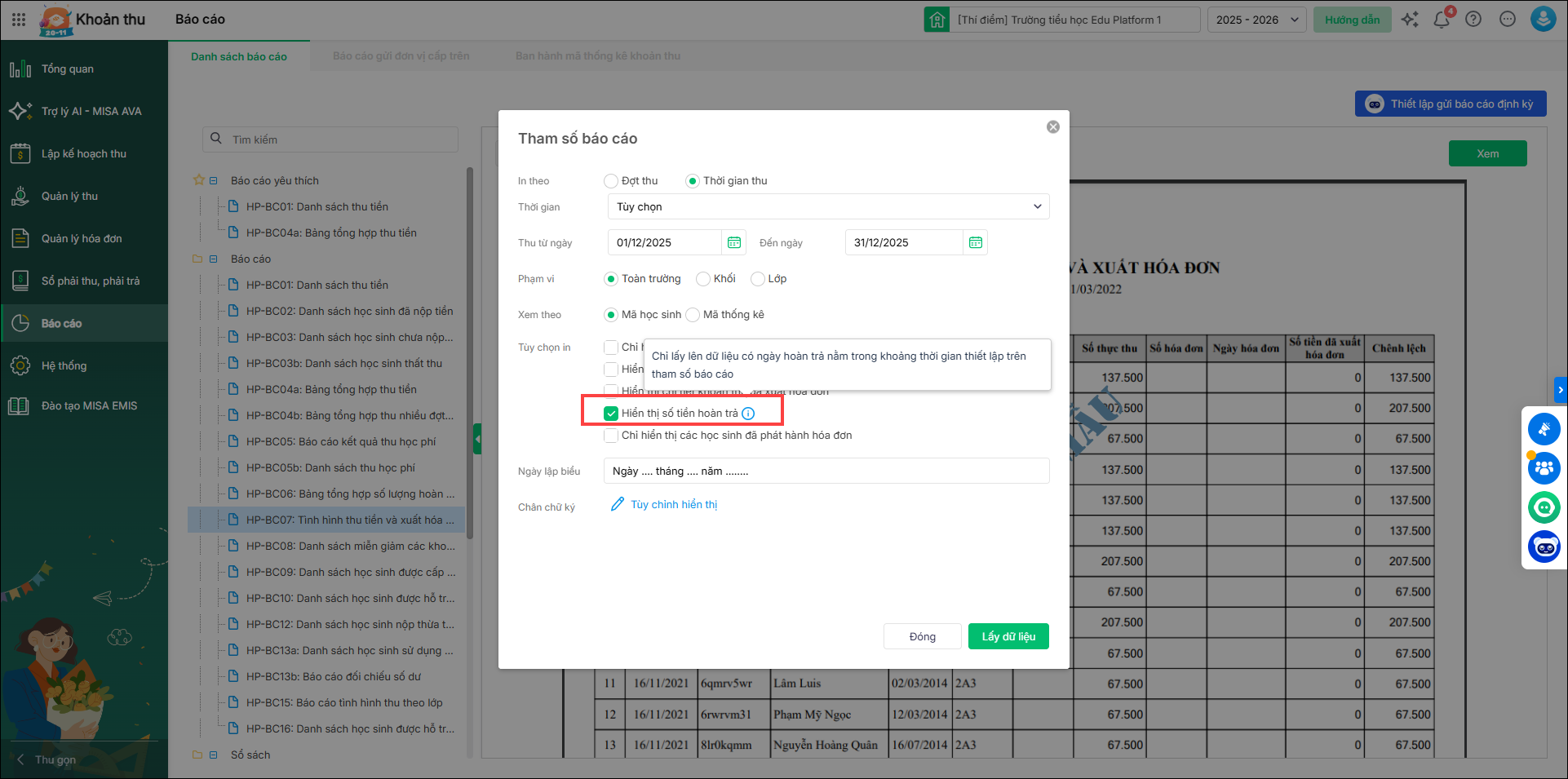 - Chọn In theo Thời gian thu: Báo chỉ chỉ lấy lên số tiền hoàn trả phát sinh trong thời gian thiết lập khoản thu