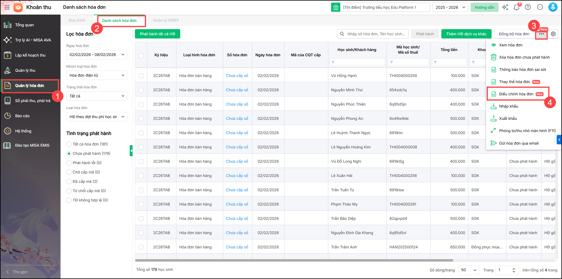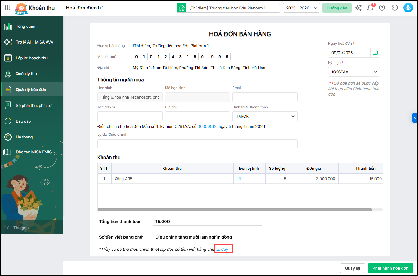 2. Anh/chị lập hóa đơn điều chỉnh trên phần mềm MISA EMIS theo hướng dẫn tại đây