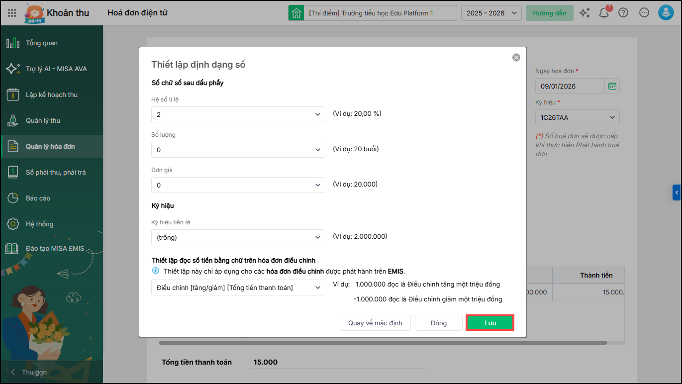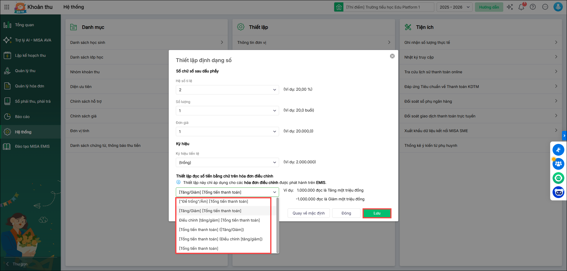 4. Phần mềm hiển thị màn hình thiết lập định dạng số. Anh/chị tiến hành thiết lập đọc số tiền bằng chữ trên hóa đơn điều chỉnh theo nhu cầu, sau đó nhấn Lưu.