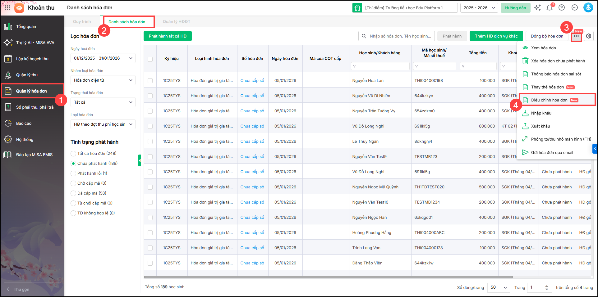 3. Vào Quản lý hóa đơn/Danh sách hóa đơn. Nhấn icon ba chấm, chọn Điều chỉnh hóa đơn.