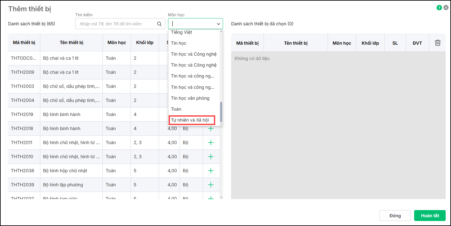 4. Chương trình hiển thị danh sách thiết bị thuộc môn học mà anh/chị vừa chọn. Nhấn dấu  (+) để thêm thiết bị cần mượn. Nhấn Hoàn tất.