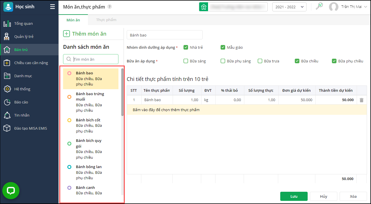 1. Vào Bán trú\Món ăn/Thực phẩm, chọn Món ăn,