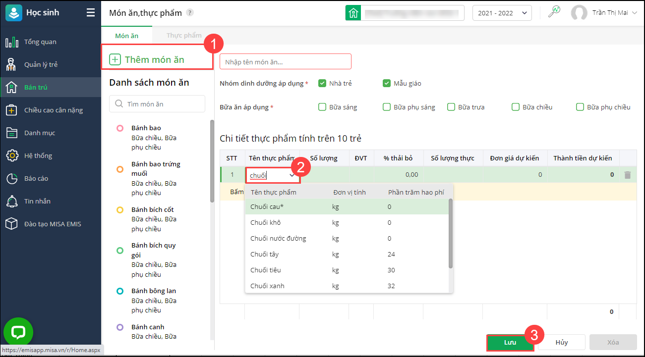 3. Trường hợp muốn bổ sung thêm món ăn/thực phẩm sử dụng để lập thực đơn, anh/chị nhấn Thêm món ăn. Khai báo thông tin chi tiết thực phẩm của món ăn.
