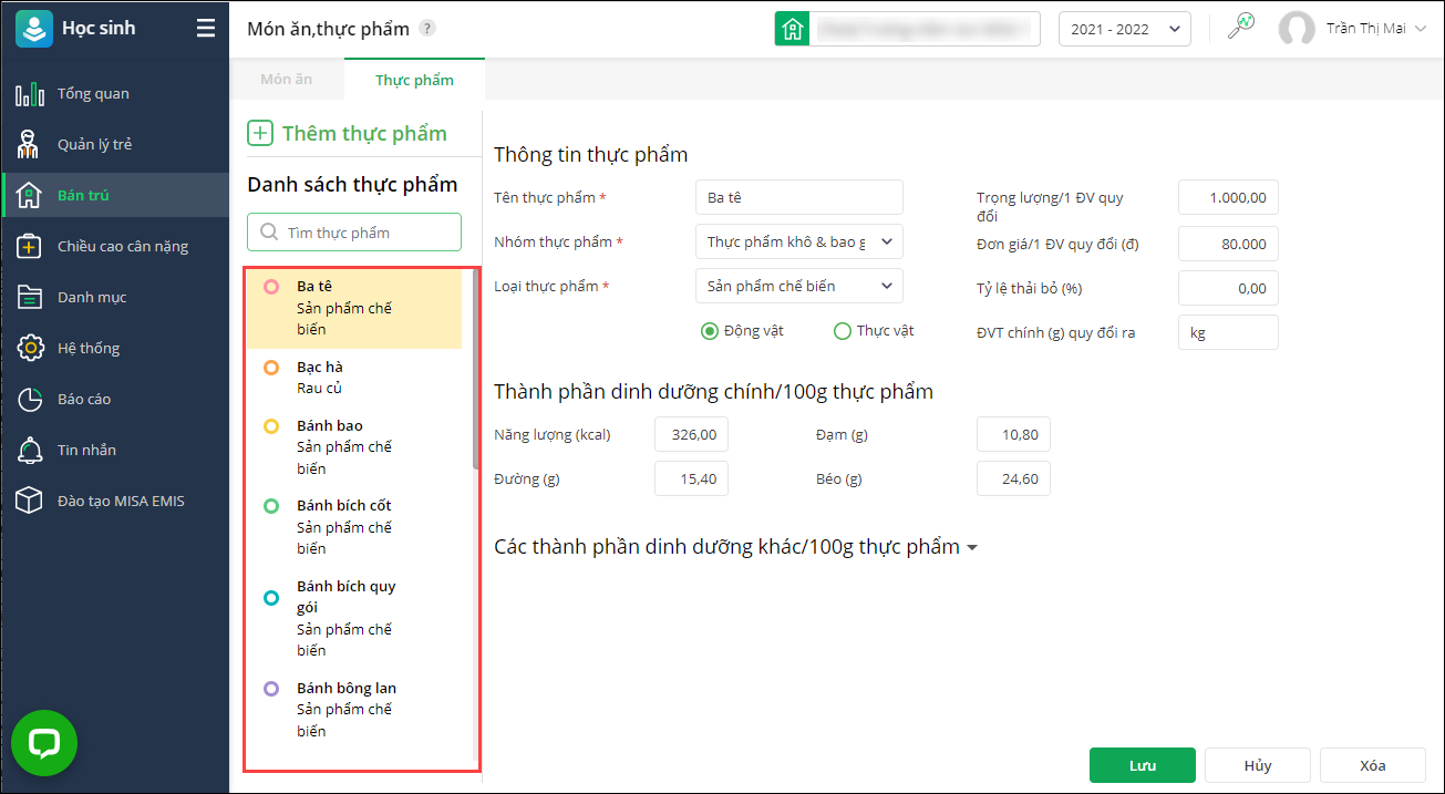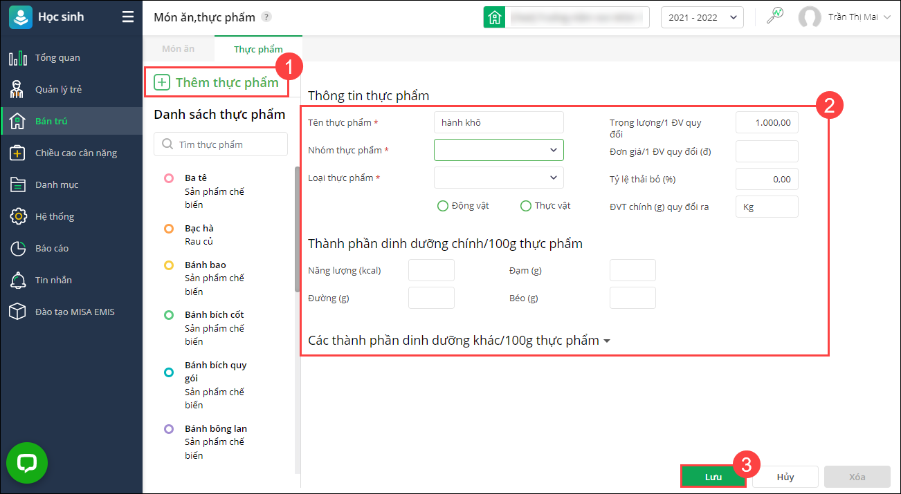 1. Vào Bán trú\Món ăn/Thực phẩm, chọn Thực phẩm.
