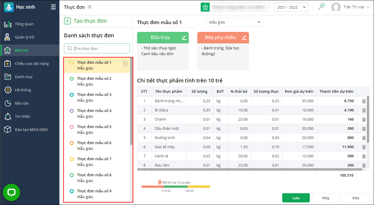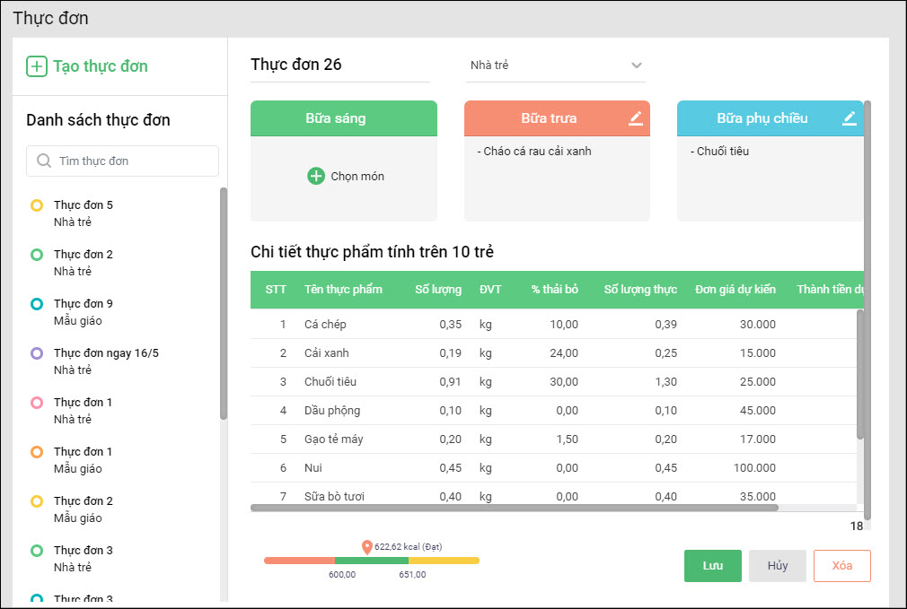 - Tên thực đơn, nhóm trẻ được áp dụng.