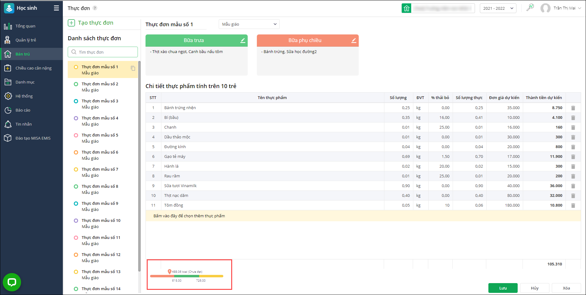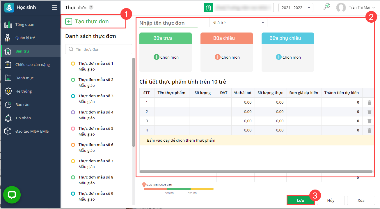 5. Sau khi thiết lập xong tất cả thực đơn trên các bữa, anh/chị nhấn Lưu.